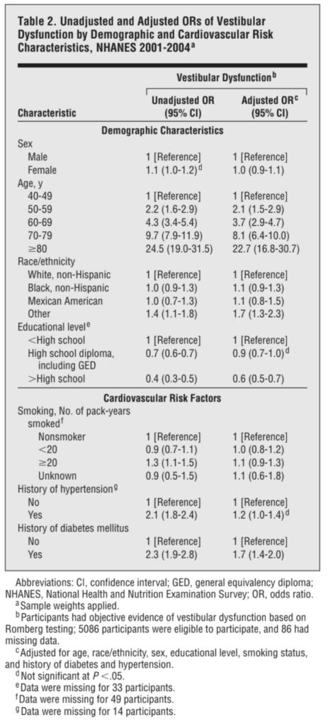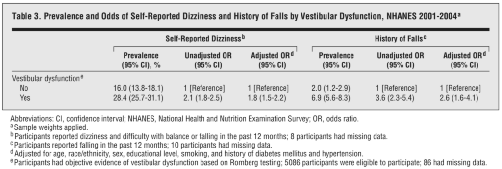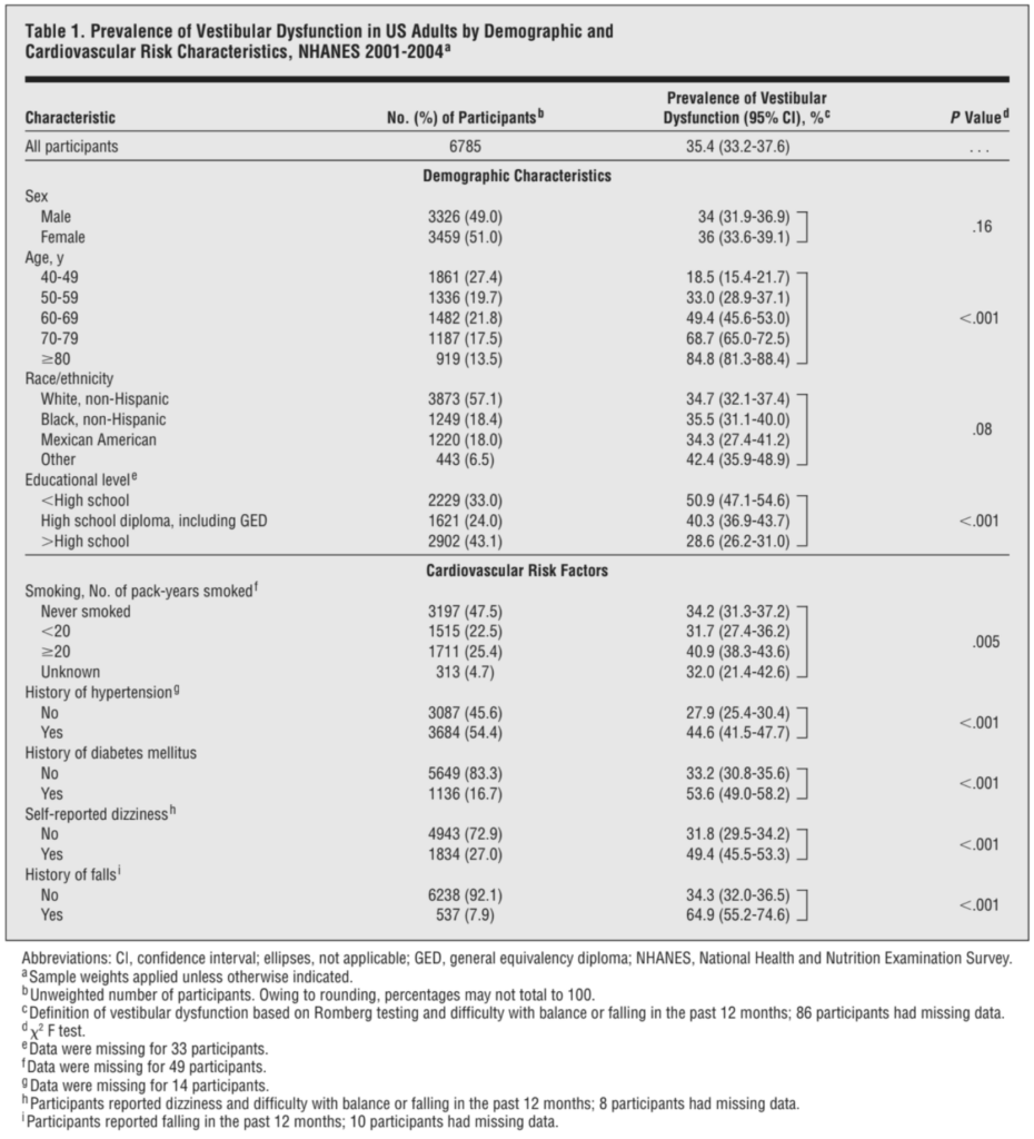 Results: From 2001 through 2004, 35.4% of US adults aged 40 years and older (69 million Americans) had vestibular dysfunction. Odds of vestibular dysfunction increased significantly with age, were 40.3% lower in individuals with more than a high school education, and were 70.0% higher among people with diabetes mellitus. Participants with vestibular dysfunction who were clinically symptomatic (ie, reported dizziness) had a 12-fold increase in the odds of falling.